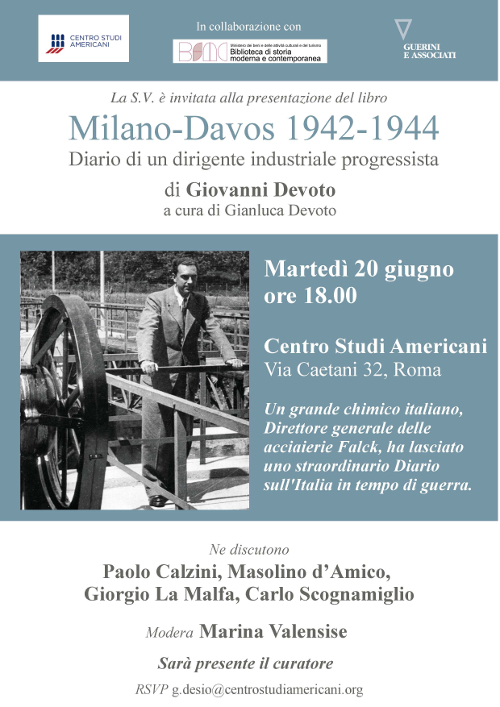 Martedì 20 giugno ore 18.00, il Centro Studi Americani, in collaborazione con la Biblioteca di storia moderna e contemporanea, invita alla presentazione del volume "Milano-Davos 1942-1944 Diario di un dirigente industriale progressista" di Giovanni Devoto a cura di Gianluca Devoto. Ne discutono Paolo Calzini, Masolino d’Amico, Giorgio La Malfa, Carlo Scognamiglio, modera Marina Valensise, Sarà presente il curatore